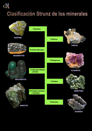 Podemos describir Mineral como compuesto inorgánico de estructura cristalina, formado como resultado de procesos geológicos. Los primeros intentos de clasificación de los minerales se remontan a los trabajos de clásicos de la antigüedad, por ejemplo Gayo Plinio Cecilio Segundo, siglo I dC. Pero los principios de la clasificación actual de los minerales, basados en la química de los mismos, fueron establecidos por el químico y mineralogista sueco Bercelus entre 1779 y 1848. El mismo concepto fué posteriormente desarrollado en la clasificación de los minerales de J. D. Dana a mitad del siglo XIX, cuando todos ellos fueron divididos en clases, en función de sus aniones, o grupos de aniones predominantesTradicionalmente, se viene utilizando, tanto a nivel universitario como en la ordenación de las colecciones de museos y particulares, la clasificación de Strunz, basada en la clásica de J. D. Dana