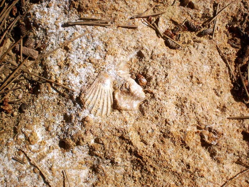 El lugar concreto al que nos dirigimos es un pequeña zona de playa fósil que se encuentra al pie de la sierra entre abundantes pinos. Aparecen unas primeras margas arenosas con restos de Bivalvos y equinodermos atrapados. curiosamente, alguna de las piezas aparece aún revestida de la capa original de nacar, pese al tiempo transcurrido y a la erosión. El piso es Mioceno.