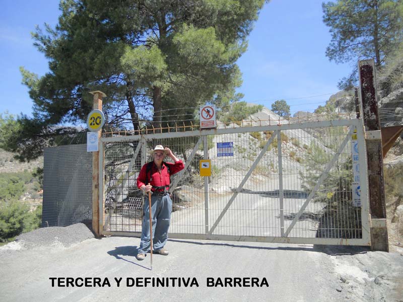 Una vez arriba, nos encontramos con la barrera basculante, esta ya conocida de otras veces, que vuelve a cortar el paso a los vehículos (cosa ya inútil puesto que ahora ya no puede llegar hasta allí ningún vehiculo.) Ignoramos las señales que indican que estamos accediendo a una cantera etc etc. y seguimos adelante para esta vez llegar a la puerta propiamente dicha, de la cantera. Candados, vallas por todos los lados, cámaras de vigilancia, empresas de seguridad, avisos y más avisos. Parece que hayamos llegado a un centro de la Nasa.