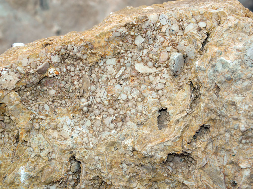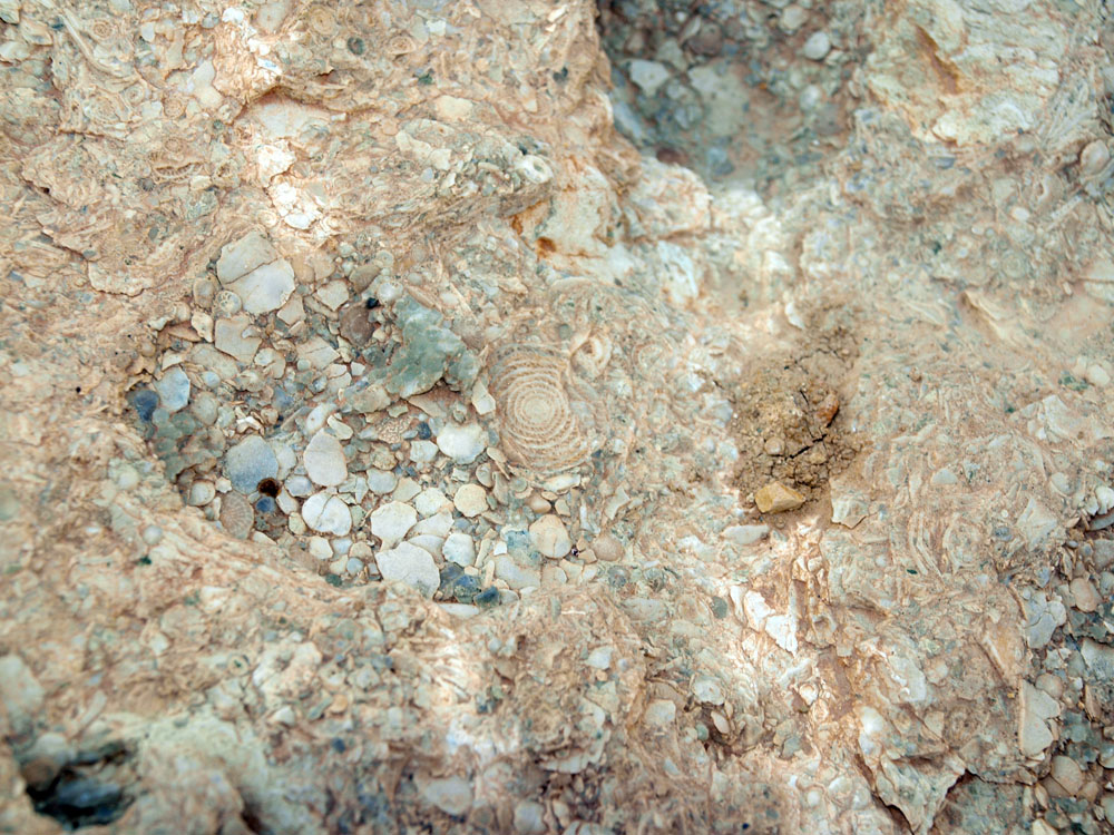 Margas y calizas terciarias rodean y se entrecruzan por todas partes en la zona de explotación. Destacan dos colores predominantes: el gris claro de las margocalizas, y el amarillento de las calizas y areniscas, a menudo recubiertas de abundante fauna de foraminíferos planctónicos, nummulites y assilinas como géneros. Se encuentran, además, erizos fósiles y macroforaminíferos bentónicos. Los paleontólogos han asignado estas margas al Eoceno medio, interpretándolas como depósitos de cuenca, de carácter pelágico, que recibían periódicamente aportaciones turbídicas.