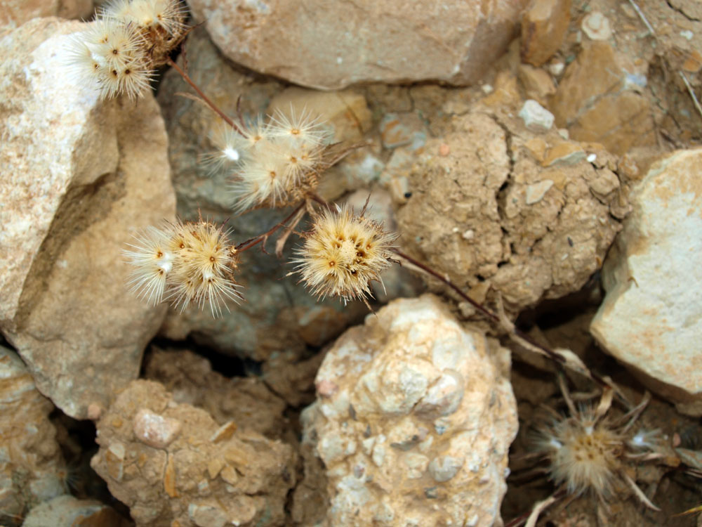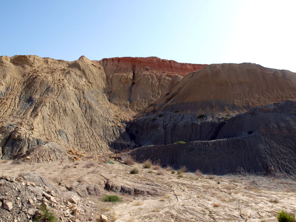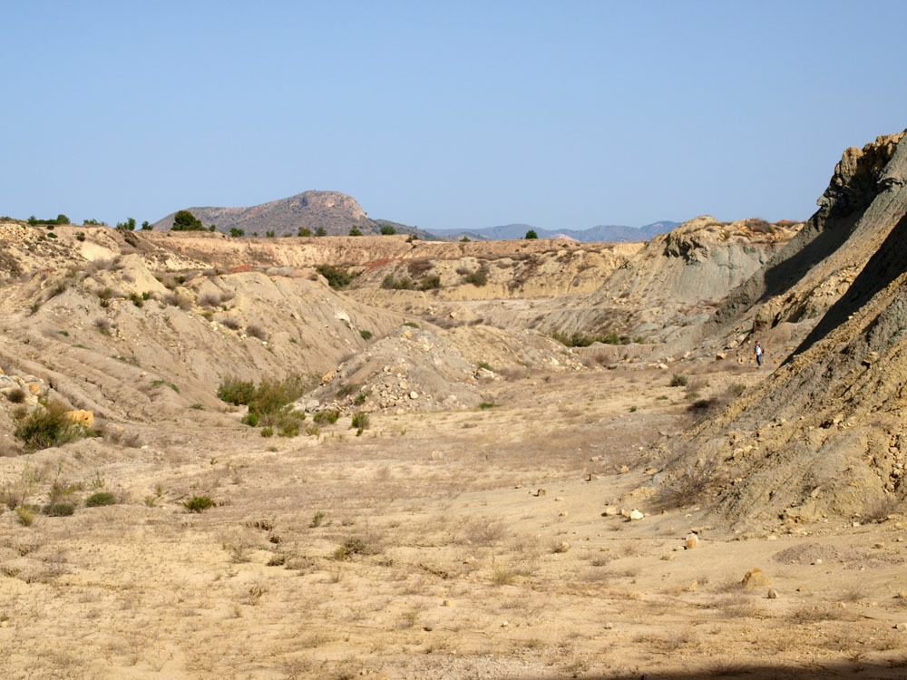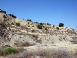 Hay abundantes montones de tierras de escasa altura, quizás frentes bajos de explotación muy lavados por las lluvias, de un color pardo a verdoso, sin vegetación, surcados de pequeñas fisuras y algunas laminitas de yesos, que dan al paisaje un tercer tono.