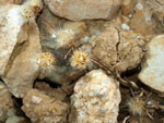 Otro mineral, esporádicamente presente en las fisuras de las calizas a techo, es la celestina, el sulfato de estroncio, que aparece en cristales agregados en abanico o círculos.