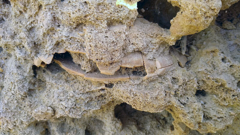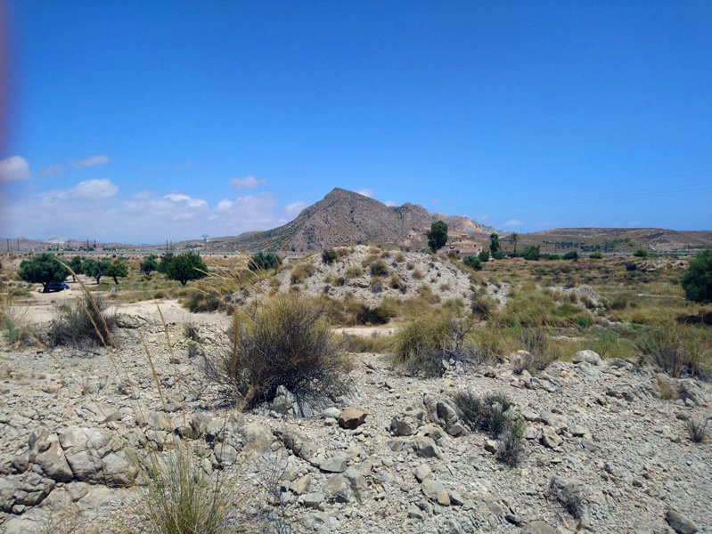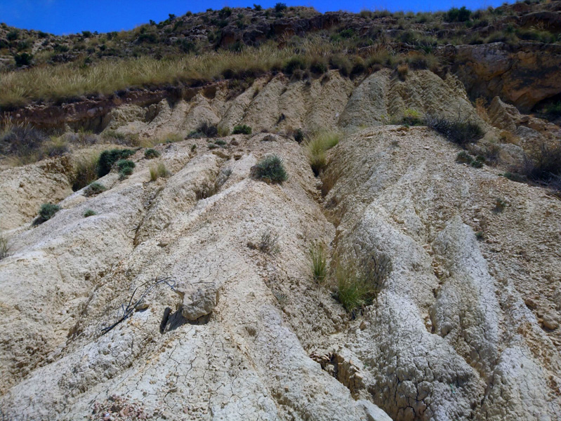 Las Atalayas Alicante Llegamos a “las Atalayas” bajo un sol que empezaba a picar sobre las 11:45, aparcamos el coche y nos dirijamos a pie hacia el cerro de “Les Atalayas”, de fácil acceso al principio empezamos a ver fósiles de Pecten del tamaño de la mano y ostrácodos del mismo tamaño incrustados en la roca, dejando atrás el Holoceno y adentrándonos en el Serravalliense, donde la caliza va pasando de blanca a amarillenta. En la primera covacha que encontramos al mirar detenidamente vemos que está formada de playa fósil, múltiples fragmentos milimétricos de conchas y arena de playa compactada, donde avistamos un diente de tiburón sin la punta desprendido de la arenisca. Comenzamos a subir, nos ayuda la áspera caliza que facilita el agarre, mientras seguimos viendo abundantes ostrácodos y algún molde interno de gasterópodo. Cerca de la cumbre vemos una veta amarillenta de aproximadamente 200 metros de longitud, que se encuentra desquebrajada, y observamos marcas de martillo o cincel en toda su longitud, así como fósiles rotos y las huellas que dejan en la roca después de su extracción, prueba del expolio al que está sometido este paraje. Después de hacer cumbre en el cerro buscamos un sitio para bajar la ladera por el lado opuesto a la subida, de nuevo la rugosidad de la caliza nos ayuda, con alguna dificultad, a media altura descubrimos una serie de covachas amarillentas del mismo estrato de que describimos al principio, donde vemos algún coral muy pequeñito, fragmentos pequeños de hueso, y en último lugar un erizo de aproximadamente 20Cm, incrustado en la roca, aplastado y cuarteado por la tectónica. En la base de la ladera opuesta, dejamos la caliza y pasamos al Albiense, margas arenosas, amarillas y blancas donde la erosión del agua cayendo por la ladera vertical de caliza desprendida, crea pequeños valles entre las margas que acaban en un vertedero lleno de basura. Donde solamente nos llama la atención formaciones espeleotemas planas, con aspecto fibroso parecido a la corteza de un árbol. En este punto empezando a sentir el calor agobiante nos disponemos a volver hacia el coche bordeando la montaña por el llano. En la ladera de la colina que tenemos enfrente observamos yesos, lapis especularis milimétricos, que hacen brillar los relieves en la arena margosa dejados por la erosión, donde no vemos nada digno de realizar una buena fotografía. En el camino de vuelta y tras un pequeño canal erosionado de lluvias, donde volvemos a ver ostrácodos y Pectinidos pasamos de nuevo al Serravalliense, esta vez en llanura, observamos varias zonas donde aflora la roca madre de la base del lecho marino. Vemos al menos una decena de agujeros del tamaño de un balón de balonmano, que nos recuerdan el expolio al cual a sido sometido este sitio por los erizos de mar que aparecieron, viendo algún fragmento de Clypeaster, e imaginando las dimensiones que debían de tener estos animales damos por terminado el recorrido, y volvemos al coche después de haber visitado un yacimiento más expoliado que las tumbas de Egipto.