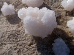 Las orillas se encuentran cubiertas de sal frágil laminada que se hunde y cruje como al pisar nieve, las piezas buenas se deben buscar en el interior del agua y totalmente sumergidas ya que las zonas expuestas rápido pierden la cristalización por la humedad de la noche y la erosión, tanto del aire como las lluvias, creando “sombreros” de placas de sal sin cristalización en su parte superior.