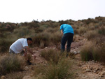 Afloramientos del Keuper Loma Badá. Petrer. Alicante Imagenes de Pedro López, Agustin Aguirrey Francisco Cantudo El yacimiento de aragonitos se encuentra al sur de la población, en el paraje del "Linde del Carrión", a la altura del kilómetro 31,5 de la A-31, entre la autopista y el vertedero de basuras. Se trata de unos terrenos del Keuper a media montaña en un cerro de pequeñas altitud, existiendo también algunos depósitos dendríticos, probablemente terciarios, en la cumbre y en la zona del vertedero. Aunque los aragonitos de este clásico yacimiento alicantino no desarrollan prismas grandes y aislados, son característica del mismo las maclas de numerosos cristales, la mayoría de un color verde grisaceo y una peculiarida, cais única de este sitio, lo que los coleccionista de Alicante llamamos medallones, que consisten en piñas de aragonito parcialmente chafados por los extremos formando una curiosa forma de medallón |