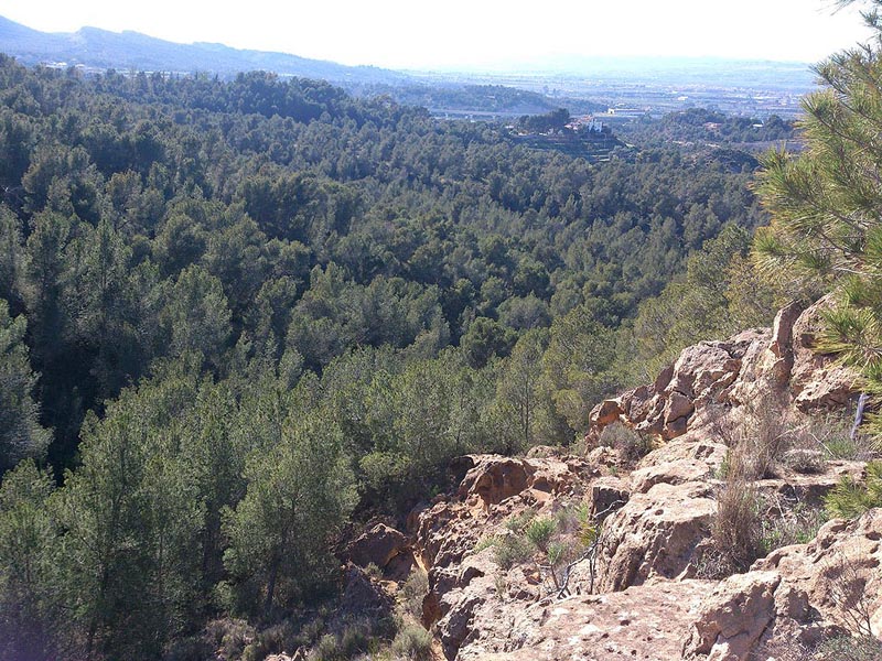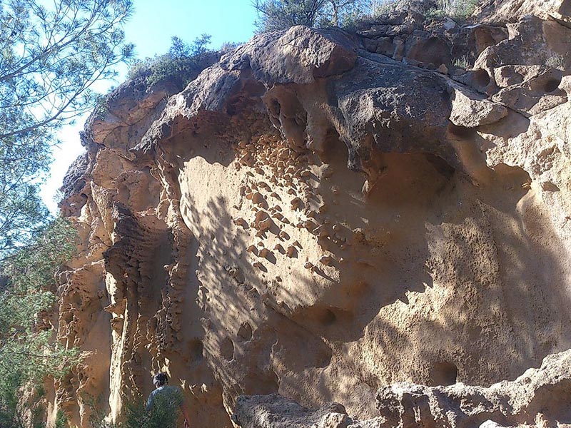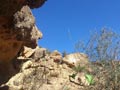 Pronto empiezan a aparecer las primeras cotas de arenisca que nos conducen a través de distintas ramblas y caminos endiablados a la zona que buscamos. Un magnífico yacimiento del Mioceno Tortoniense Superior situado en un barranco. Tras descansar unos minutos y reponer fuerzas, comenzamos a examinar el lugar, que resulta ciertamente agreste, y poco explorado, con muchos y exuberantes ejemplares de palmito. La primera sorpresa aparece al encontrar un Clipeaster (equinodermo del mioceno) de gran tamaño, que fotografiamos in situ y dejamos semienterrado. Toda la escombrera se encuentra llena de pequeños fragmentos de clipeaster totalmente opalizado, en varios tonos, de terebratulas y de bivalvos diversos. Aparece un curioso balanus, fosilizado sobre un fragmento de equinodermo.