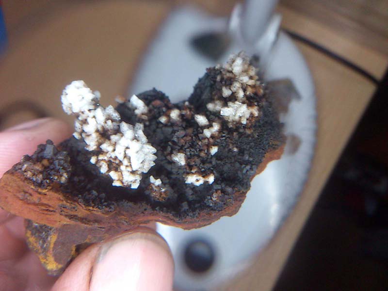 Mina Las Nogueras Sierra de Cartagena la Unión El miercoles dia 27 de Marzo, la víspera de la inauguración de la feria de minerales y fósiles de La Unión volvemos a salir con los mismos colegas que el día anterior, esta vez por la zona de los campos de golf en varios minados cercanos a las nogueras. Allí podemos disfrutar de una mañana estupenda buscando muestras de Barita, Psilomelana, Pirolusita y Goethita. Llaman la atención poderosamente unos cristales de barita totalmente recubiertos de Psilomelana o Romanechita. |