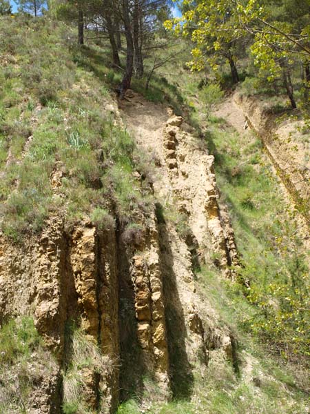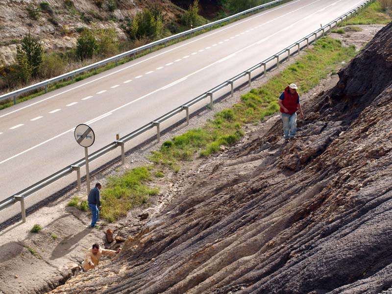 Como el cielo amenaza lluvia, y aunque de forma un tanto desordenada vamos abandonando la hondonada para dirigirnos a la zona superior, mucho mas segura en caso de aguacero. Visitamos la zona del Jurásico Medio, en la que se pueden ver, que no coger pues en Teruel está prohibido, un sinfín de restos fósiles relacionados con el medio marino. Paredes enteras repletas de bivalvos del género ostrea, Bivalvos Heterodontos, y Pectínidos. De igual forma aparecen los moldes internos de varias especies de Turritelidae.