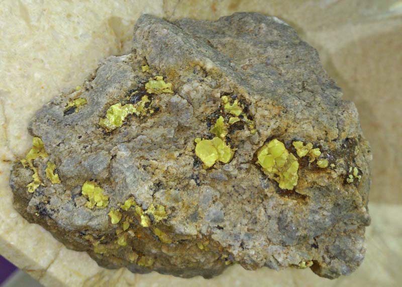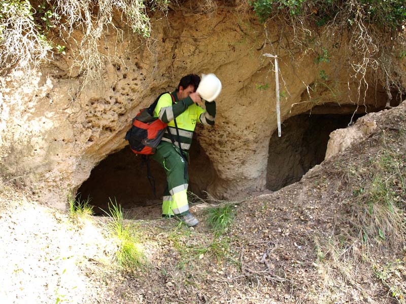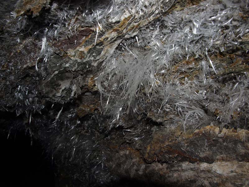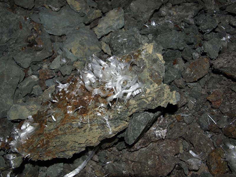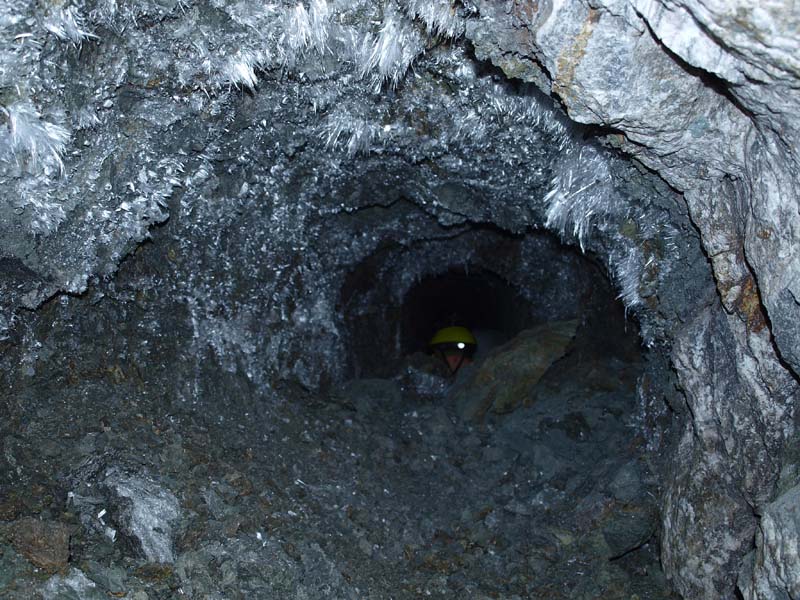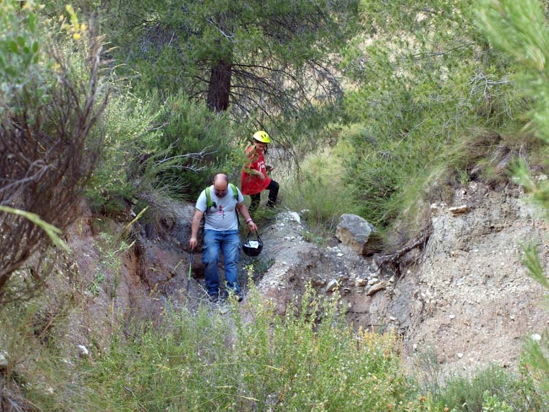 El pasado Miercoles 26 de Junio, aprovechando que Alvaro y yo pasamos el día en Alicante contactamos con dos de los compañeros de la zona y de forma improvisada hacemos una breve salida de tarde hacia la mina Tobillo. Entre que el paraje se encuentra alejado y que tardamos casi dos horas en encontrar la pequeña bocamina que da acceso al túnel la visita a la mina ha de ser rápida pues la noche se va echando encima. Apenas 30 minutos transcurren contemplando las eflorescencias de Epsomita, para salir nuevamente al barranco y volver por el rocoso y arduo camino que nos lleva de regreso al coche donde llegamos siendo ya pasadas las 8,30 horas con clarísimos síntomas de agotamiento. Apenas unas muestras de azufre cristalizado de una escombrera exterior dan fe de la visita. Un refresco en Agost y damos por concluida una salida breve, muy dura pero inolvidable.
