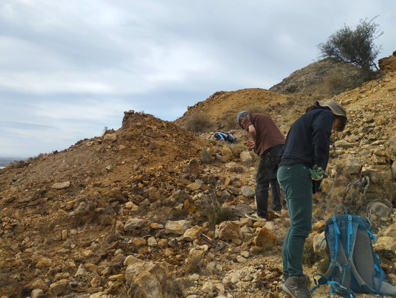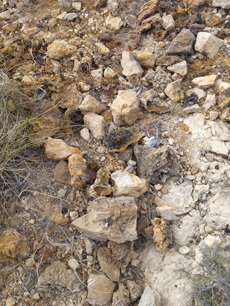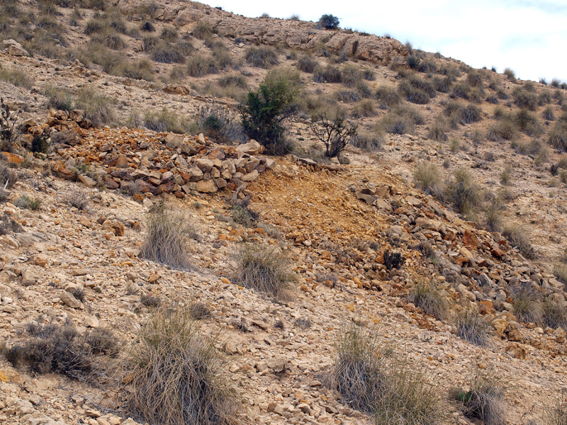 Minas de Ocre del Sabinar San Vicente del Raspig / Mutxamel. Alicante Imágenes de Pedro López, Isabel Martínez, Elena Ivanova, Agustín Aguirre y Ricardo Olabegoya Estrela Visitamos una de las dos grandes explotaciones de ocre de la provincia de Alicante, La concesión de Alicantina Minera del Ocre situada al norte de la localidad de San Vicente del Raspeig, en el área del Tosal Redo, Bec del Águila - Sabinar, en terrenos pertenecientes al Albiense superior-Cenomaniense.En esta ocasión visitamos zonas de explotaciín situadas en las cercan ias del Bec del Aguila. Toda la zona visitada este repleta de pozos y socavones sin ninguna señalización y a veces en parte cubiertos por plantas, lo que los hace prácticamente invisibles hasta que esta justamente casi encima. En la zona visitada no se encuentran piezas de mucho interés salvo algunas muestras de calcita con cristalizaciones diversas de pequeño tamaño, alguna que otra curiosa goethita y algunas muestras de aragonitos tipo estalactiticos, |