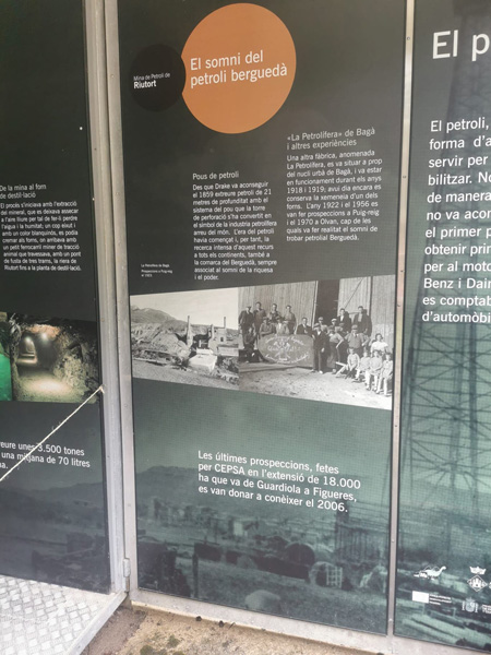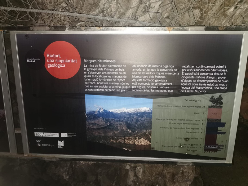 La Compañía Minera de Riutort, creada en 1906, inició la construcción y explotación de esta mina. Debido a la nacionalidad de los nuevos propietarios desde entonces la mina de petróleo de Riutort se conoció con el nombre de la mina Dels Francesos (es decir, la mina "de los franceses"). En los 350 metros de la mina, entre la galería principal, la transversal y la secundaria, y durante los 10 años que estuvo en funcionamiento (de 1906 a 1916) se extrajeron aproximadamente unas 3.500 toneladas de margas bituminosas. El proceso de restauración de la boca y de parte de los 340 metros de galerías convierten esta mina en un recurso visitable que permite ver las diferentes capas de margas y calizas, y cómo brota el petróleo siendo palpable el característico olor de los hidrocarburos. La mina de Riutort es una de las poquísimas minas subterráneas de petróleo que hay en el mundo. En el año 1905, los ingenieros franceses Jules Claviez y Philipp Petit empezaron su perforación. El petróleo se extraía de las capas de margas bituminosas que al principio afloraban al exterior y que, posteriormente, fueron buscadas a través de minas de galería para sacar mayor beneficio. De la Mina de Riutort no salieron más de 500 toneladas de petróleo en 12 años de explotación y después de la excavación de 350 metros de galerías. Se trata, pues, de una obra inmensa con un rendimiento en petróleo muy exiguo. Su singularidad mundial, sin embargo, ha comportado su reciente musealización y habilitación para la visita. |