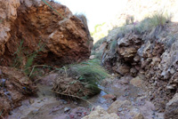 Diapiro Pinoso. Alicante Imágenes de Pedro López El diapiro de Pinoso se encuentra situado en la zona más occidental de la provincia de Alicante y próximo a la localidad del mismo nombre. A nivel regional, se puede decir que este punto constituye el único afloramiento triásico del Prebético interno central, comportándose tectónicamente como una unidad de despegue. Litológicamente, está constituido por arcillas y margas rojas con yesos, en facies Keuper, observándose bloques de dolomías tableadas mezcladas con estas mismas arcillas. Morfológicamente constituye un domo de intrusión de bordes recortados y contorno elíptico, con laderas de tipo abarrancado donde tienen lugar importantes procesos de disolución, sufusión y abarrancamiento. También es importante señalar la existencia de numerosas "pozas" y "agujeros", situados en la zona más superior del diapiro y que se producen como consecuencia de la disolución de los materiales yesíferos y su posterior hundimiento. El interés económico del diapiro de Pinoso, reside en la explotación de los materiales salinos que allí se encuentran, alimentando mediante un "salmueraducto" a las salinas de Torrevieja. En esta ocasión visitamos una de las ramblas de dicho diapiro situada junto a las casas del Faldar donde podemos localizar pequeños cristales de hematites de hábito bipiramidal hexagonal