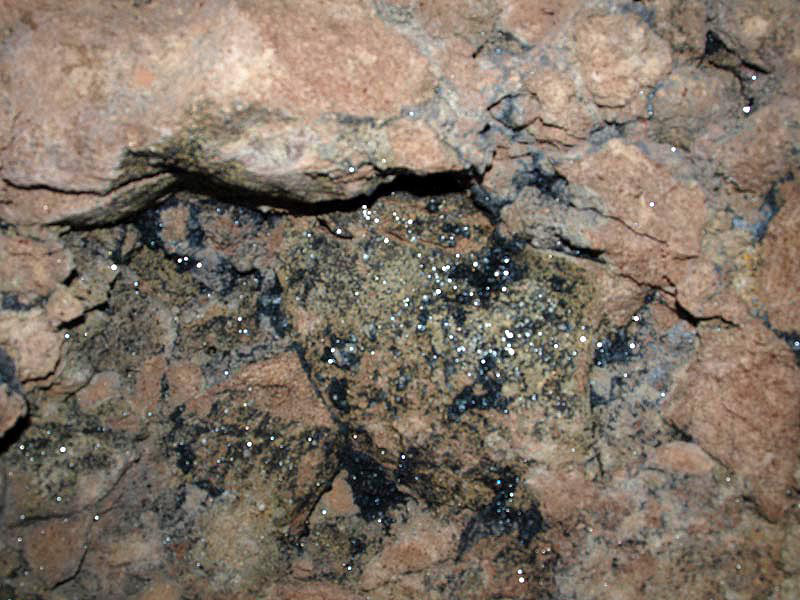 Mina Nuestra Señora del Carmen La Celia, Jumilla, Murcia. Imágenes de Pedro López y Paco Mayor Las minas de la Celia, próximas a la localidad Murciana de Jumilla son el mejor yacimiento español de fluorapatito. Las minas se explotaron a principios del siglo XX para extraer apatito y producir abonos fosfáticos. En las labores participaron algunos técnicos procedentes de Bilbao, ya que la zona carecía de antecedentes mineros y por tanto de personal cualificado (cfr. Revista Bocamina, 1994). Las labores, que son exclusivamente de interior han sido catalogadas en 1989 como de interés geológico por la Junta de Murcia. La mineralización encaja en rocas volcánicas lamproíticas roca tipo que recibe el nombre local de “jumillita”, de edad intrapliocena, y emplazados a merced de una profunda falla (Bocamina, 1994). Dichas rocas se presentan en forma de coladas volcánicas, lavas masivas y piroclastos. Gran parte del edificio volcánico ha sido erosionado por lo que sólo queda la zona de raíz del antiguo pitón o domo volcánico. Es en estas zonas porosas de tobas y aglomerados por donde circularon los fluidos depositando cristales en las cavidades. También se observan rellenos de grietas y filones con calcita, apatito y hematites. Aunque el de mayor interés mineralógico es el apatito, no es el mineral más abundante. El más extendido en el yacimiento es el hematites, que provoca un curioso efecto de luces y brillos que salpica paredes y techos |